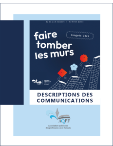 C’est avec un plaisir renouvelé que nous vous invitons à soumettre une proposition de communication pour le congrès organisé par l’Association québécoise des professeur.e.s de français, ayant pour thème Faire tomber les murs. Celui-ci se déroulera du 26 au 28 novembre 2025, au Hilton Québec.