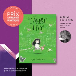 - Dans la catégorie « Album 5-12 ans » : L’arbre de Lily de Marie-Louise Gay (Dominique et compagnie). Ce qu’en dit le jury : « Un doux récit écologique pour susciter l’empathie. »