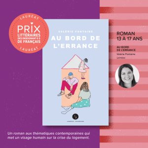 - Dans la catégorie « Roman 13-17 ans » : Au bord de l’errance de Valérie Fontaine (Leméac Éditeur). Ce qu’en dit le jury : « Un roman aux thématiques contemporaines qui met un visage humain sur la crise du logement. »