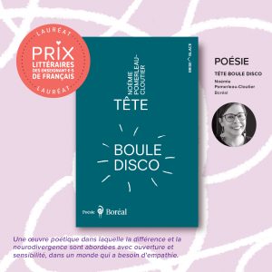 - Dans la catégorie « Poésie », Tête boule disco de Noémie Pomerleau-Cloutier (Éditions du Boréal). Ce qu’en dit le jury : « Une œuvre poétique dans laquelle la différence et la neurodivergence sont abordées avec ouverture et sensibilité, dans un monde qui a besoin d’empathie. »